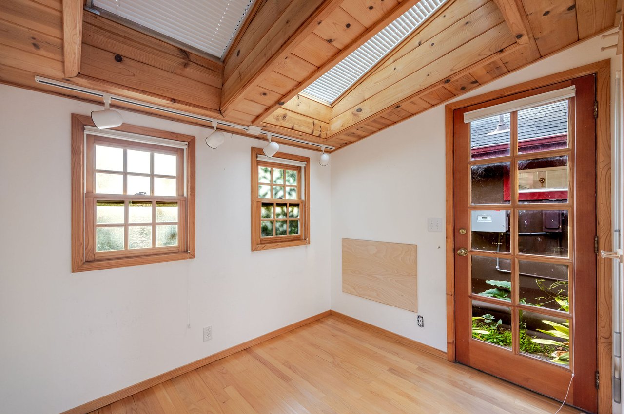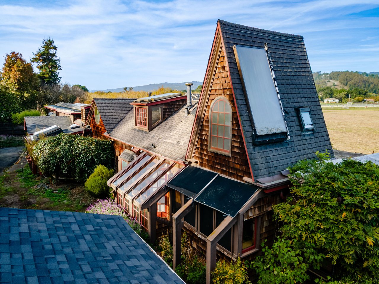 The light filled home w/ high ceilings, many skylights, and windows overlooks the gorgeous neighboring farm property. In the well-sized kitchen there is a new induction range, new refrigerator, and new washing machine in laundry. The remainder of the main house has two sunrooms, 3 bathrooms, cozy gas burning stove, and several loft areas.
